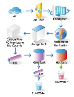 Um sicherzustellen, dass das Trinkenwasser frisch und sauber ist, hat EcoloBlue™ einMulti-Filter-System (frei von Chemikalien) mit Umkehr-Osmose und Ultra Violet Filter verwendet. Die elektro-statischen Anti-Bakterien- und Anti-Pilz Filter sind für die Reinigung der Luft in Ihrem Haus/Buro. Das Wasser kann heiß (95 C) oder kalt (5 C) genutzt werden, ein Funktion auf allen Maschinen. Alle AWG-Maschinen können außerdem zum Filtern an das Stadt- oder Hauswasser angeschlossen werden.
